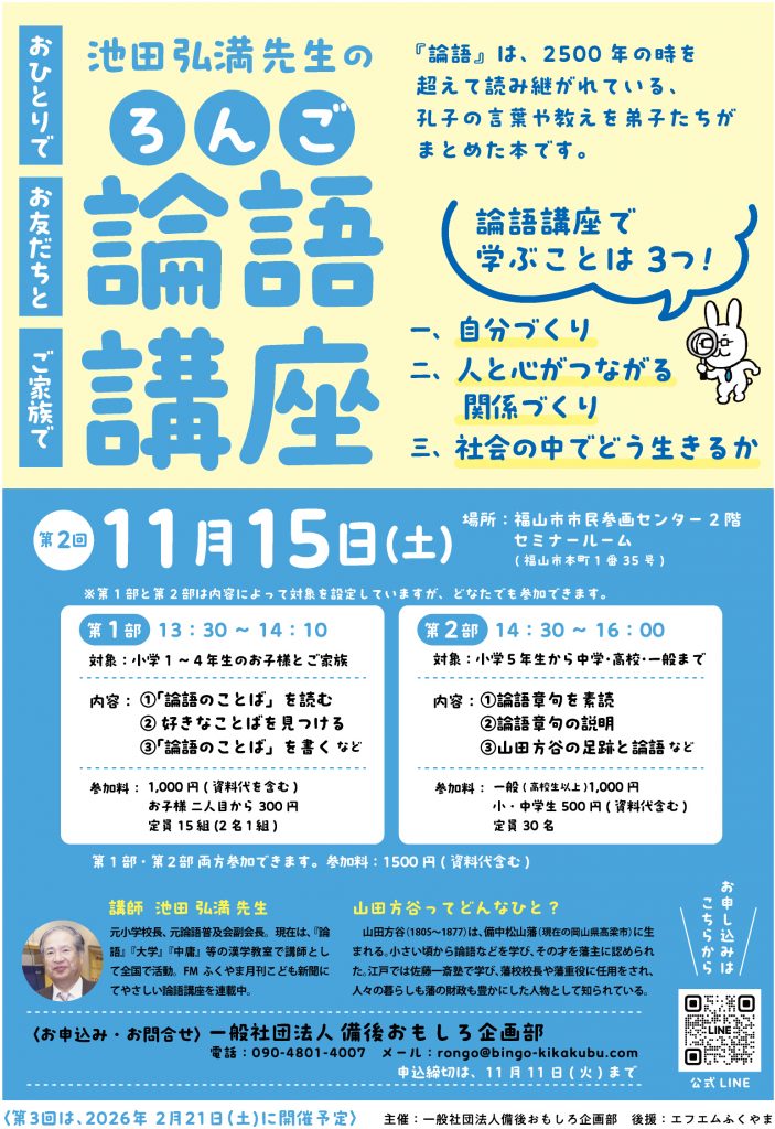 「論語」は、2500年の時を超えて読み継がれている、孔子の言葉や教えを弟子たちがまとめた本です。元小学校長で元論語普及会副会長で現在は『論語』『大学』『中庸』などの漢学教室で講師として全国で活躍され、FMふくやま月刊こども新聞では、やさしい論語講座を連載中の池田弘満先生の講座です。おひとりで、おともだちと、ご家族でぜひご参加ください。